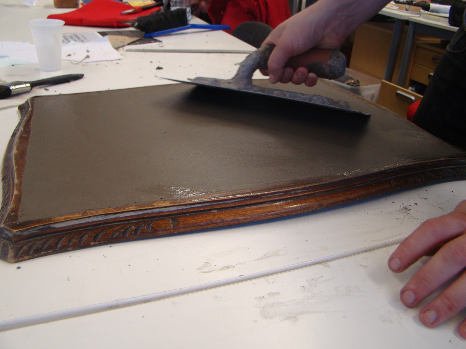 One is the carrying on of the furniture restoration. The different parts that need testing at the moment are the new mix of concrete including a higher fly ash level and a fewer sand level, using a series of plastic fibres, pigments and two different topical sealants. These will all be tested tomorrow, as well as a mould being made out of silicone.